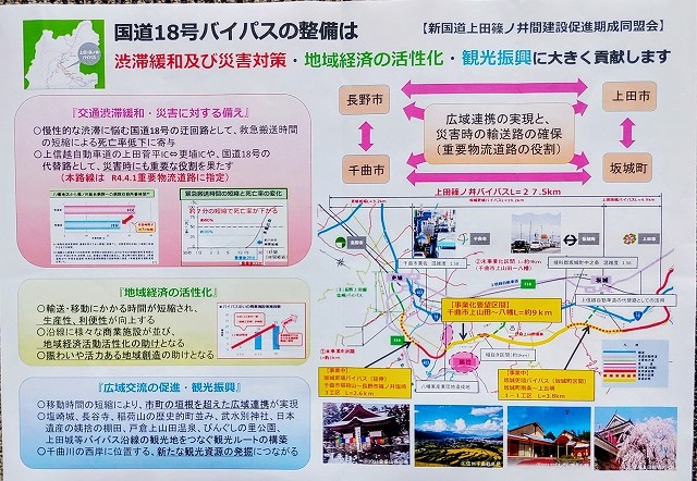 新国道上田篠ノ井間(国道18号バイパス)の建設促進活動は全長が27.5Kmあり上田市、坂城町、千曲市、長野市にかかる新国道です。