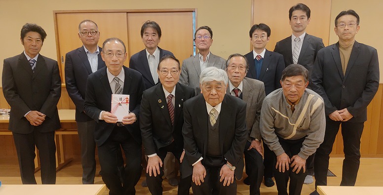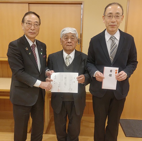 ▼写真左から:山村、大橋房夫 村上会会長、宮本隆 村上小学校長