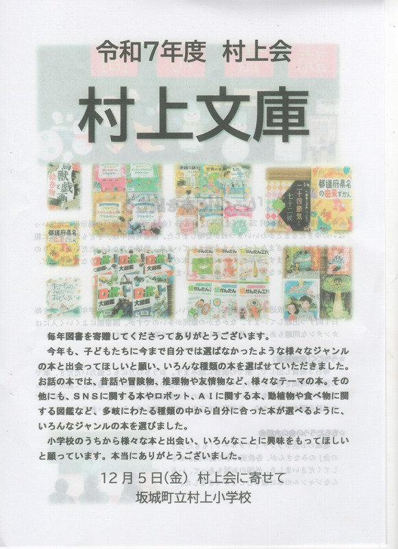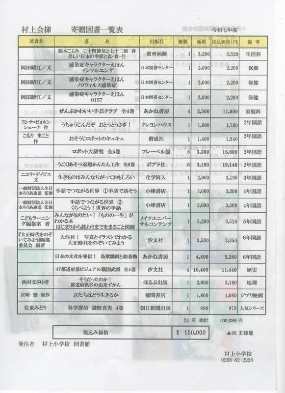 村上会の皆さんからは、毎年毎年、地元の村上小学校の子供たちに図書のご寄付をいただいています。