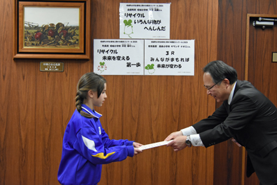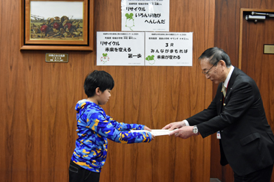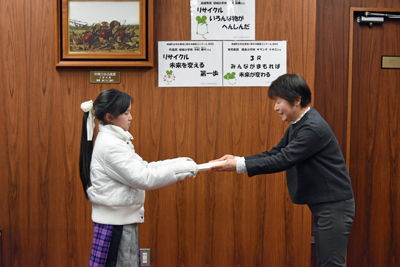 最優秀賞を受賞された宮沢さんは、「ごみについての勉強をしていく中で、あっこんなものも、こんなものまで、リサイクルになるんだ。」と感じ、今回の標語が浮かんだと話されていました。また、今回の受賞については、「賞を取るのが初めてなので、うれしい。」「今後もごみについて考えていきたい。」と話していました。