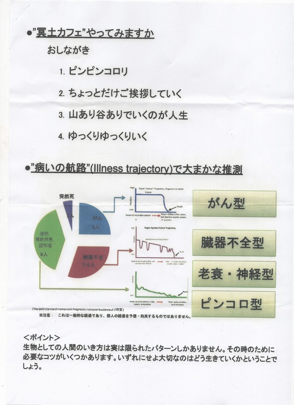 本日は、「メイド・カフェ」ならぬ、「冥土カフェ」のお話などをされ、「ピンピンコロリ」、「ちょっと挨拶」、「山あり谷あり」、「ゆっくり ゆっくり」の四つの死に方死に方の内どれが良いですか。などと、各々の特徴などを話され、どのパターンが良いかなど、グループディスカッションもされ、満員の会場は大いに盛り上がりました。