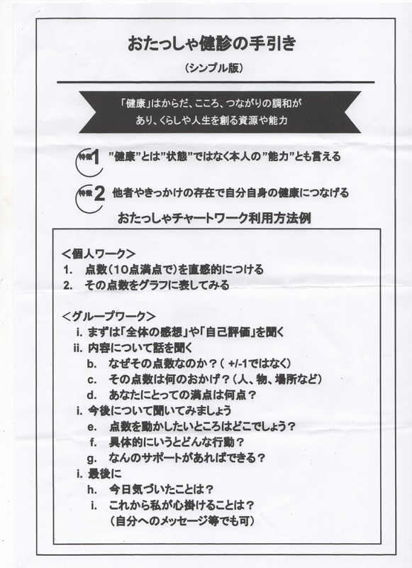 また、最後のセッションで、「おたっしゃ健康の手引き」のお話もされ、参加者の皆さん全員参加のワークショップもご指導いただきました。