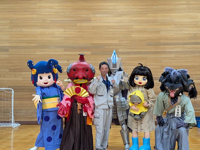 ▼写真中央は、防災キャラクターに囲まれた、長野県千曲建設事務所 足立修所長さん
