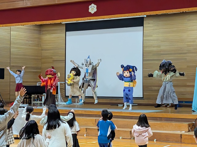 災害をイメージしたキャラクターが登場するショーや、模型を使って土砂災害の学習が行われ、地域の災害のことや、砂防堰堤など町内の防災対策、などについて楽しく学びました。