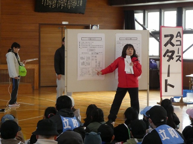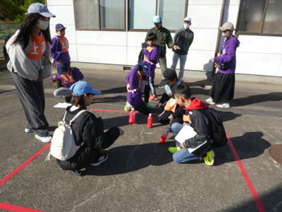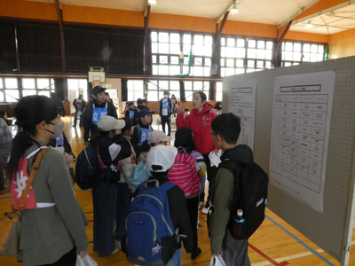 参加者は、子どもと大人で2~6人のチームを作り、びんぐしコース、じざいさんコースに分かれ、村上小学校体育館をスタート。友達と相談しながら、チェックポイント探しや各コースの問題、ミニゲームに取り組んでいました。