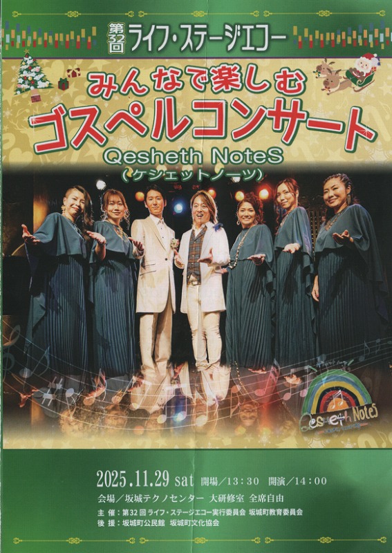 昨日(11月29日)、坂城テクノセンターで Qesheth NoteS (ケシェットノーツ)さんによるゴスペルコンサートが開催されました。素晴らしいゴスペルのハーモニーをエンジョイさせていただきました。以下、坂城町ニュースよりご覧ください。