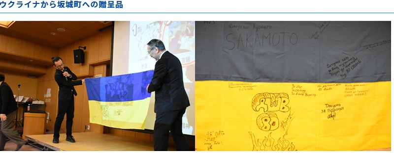 講演会の最後には、ウクライナからの国旗などが坂城町へ贈呈されました。