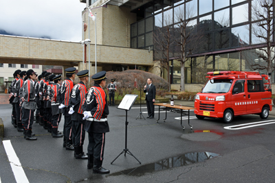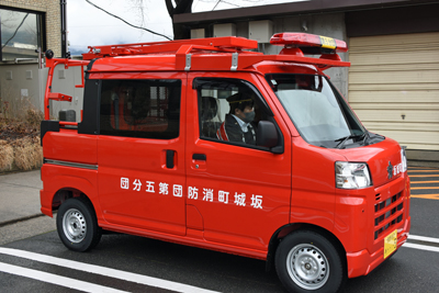 昨日(3月18日)、坂城町消防団第5分団に新しい軽四輪駆動積載車が整備され、入魂式が行われました。